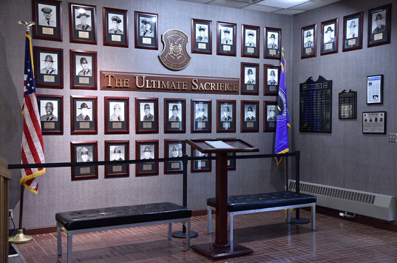 The Photo shows the Memorial Dedication to the 31 Troopers who have been killed in the line of duty since the Patrol was founded in 1931. This display, along with vehicles, and equipment used throughout the history of the Missouri State Highway Patrol, as well as educational displays and simulators can be found in the Colonel Alvin R. Lubker Memorial Safety and Education Center, located in the basement of the Patrol's General Headquarters at 1510 East Elm Street, Jefferson City, Missouri. Admission is free and the hours are Monday – Friday from 8:00 AM to 5:00 PM.